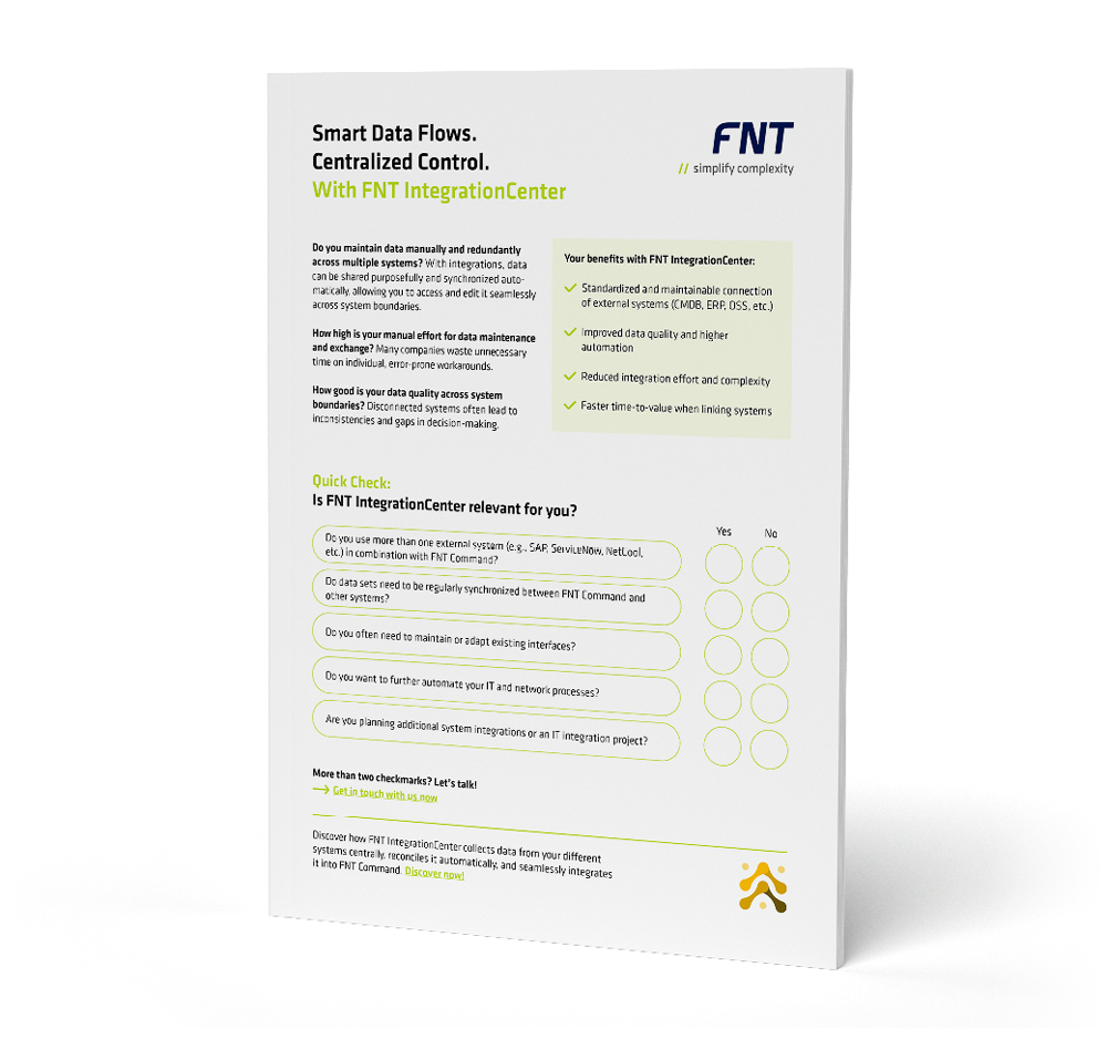 FNT IntegrationCenter collects data from your different systems centrally, reconciles it automatically, and seamlessly integrates it into FNT Command. Take our quick check to see if it’s right for you.