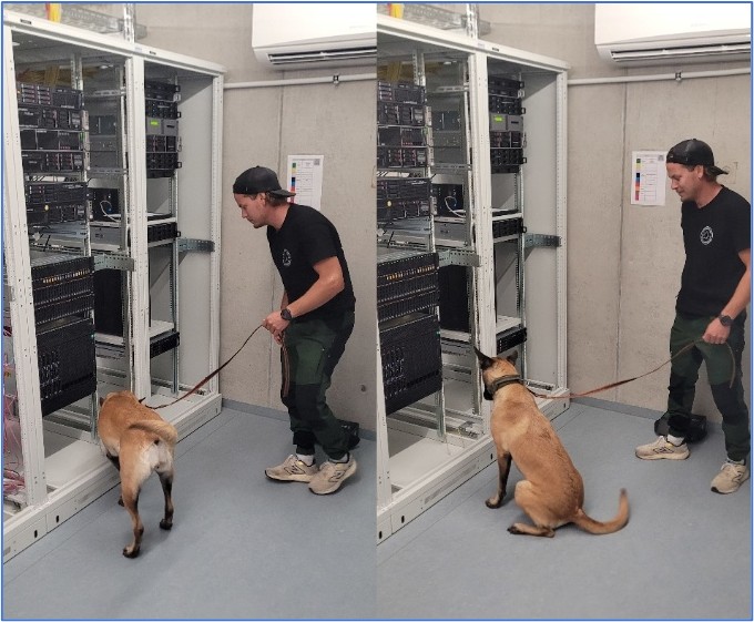 Alles wurde sauber protokolliert – nur für den Fall, dass Ace einmal scheitern sollte. Als alles vorbereitet war, betraten Martin und Ace den Raum. Ruhig und fokussiert begann sie ihre systematische Suche. Behutsam führte Martin sie durch die Gänge aus surrenden Racks und blinkenden LEDs. Trotz der herausfordernden Umgebung bewegte sich Ace mit leiser Präzision – Nase nah am Boden, Schwanz still, hochkonzentriert.