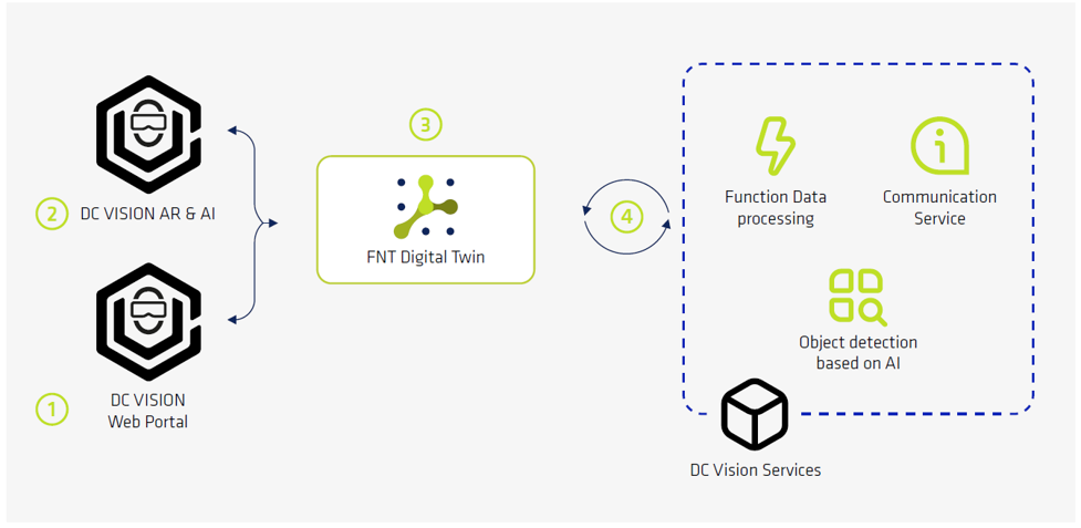 FNT Command serves as the authoritative digital twin for all physical infrastructure and configuration data, while DC Vision provides engineers with AR-enabled, on-site access to view and update information directly at the rack. Through seamless API integration, any planned or unplanned change is immediately reflected in the digital twin.