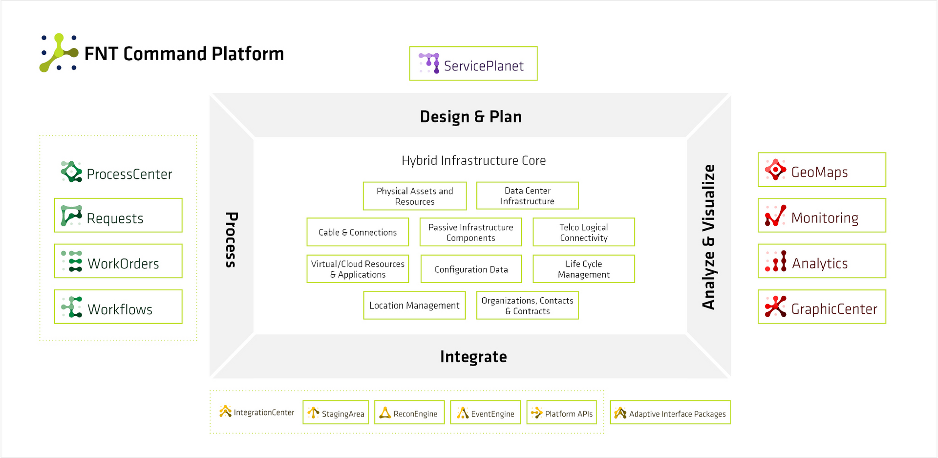 FNT’s cloud-ready Command Platform offers an extensive portfolio of functionalities to facilitate Hybrid Infrastructure Management (HIM). This includes the integrated planning, control, and documentation of all important areas of infrastructures for enterprise IT, data centers and telecommunications. The FNT Command Platform is based on the proven FNT data model. This data model covers networks, applications, hardware, and services. It also represents the relationships and dependencies between them. Other add-on features are available to make infrastructure management much easier and enable flexible integration with other systems.
