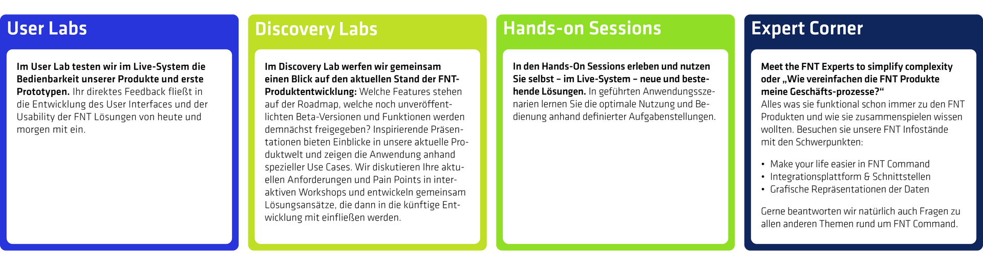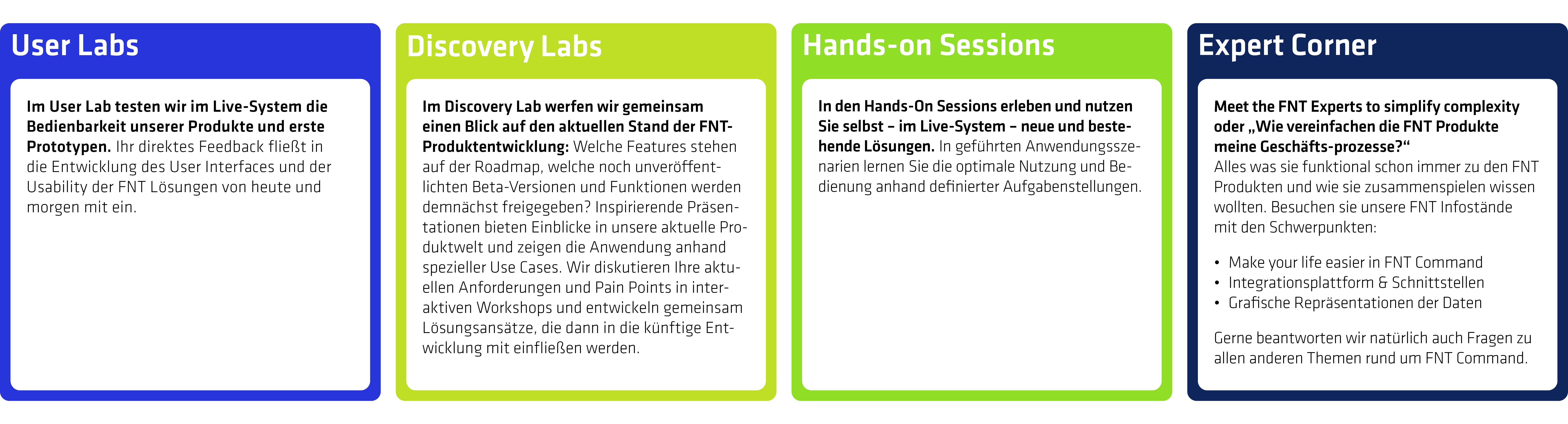 Holen Sie sich in Workshops, Hands-on Sessions und bei unseren Experten Anregungen, wie Sie FNT Command im Alltag noch effektiver nutzen können.