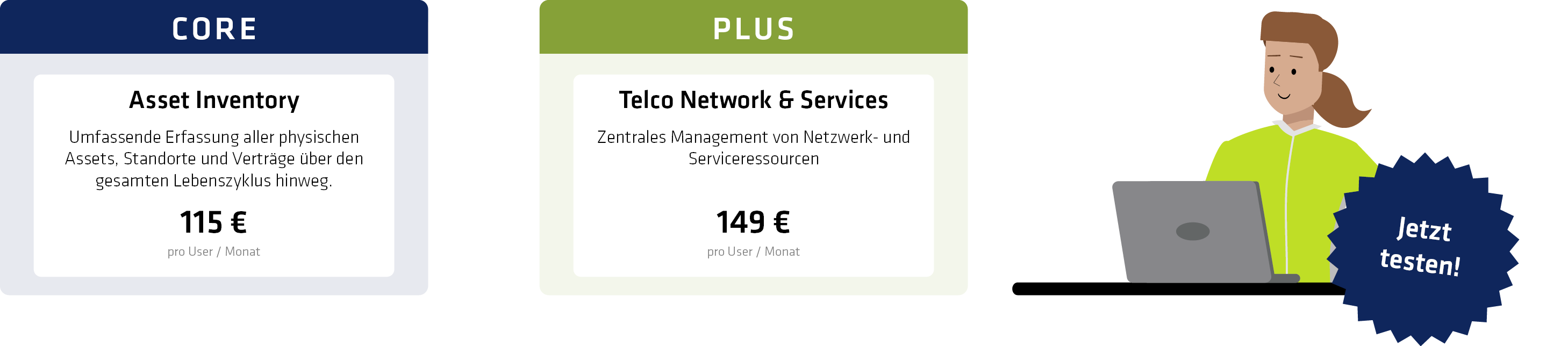 Wenn Sie Netzwerk- und Serviceressourcen zentral verwalten, durchgängige Transparenz schaffen und Planung sowie Betrieb Ihrer Telekommunikationsinfrastruktur optimieren möchten, sind unsere Pakete Asset Inventory und Telco Network & Services die passende Wahl.
