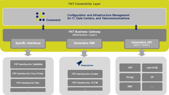 Eine Vielzahl von Integrationskonzepten wurden bereits zu SAP, SMS, unterschiedlichen Netzwerkmanagement- und TK-Systemen, Visio, eHealth, Remedy, Peregrine uvm. erfolgreich realisiert. Darüber hinaus verfügt FNT Command über ein standardisiertes Programmier-Interface „API“, welches eine umfangreiche Bibliothek an Funktionsaufrufen für Webservices bereitstellt.